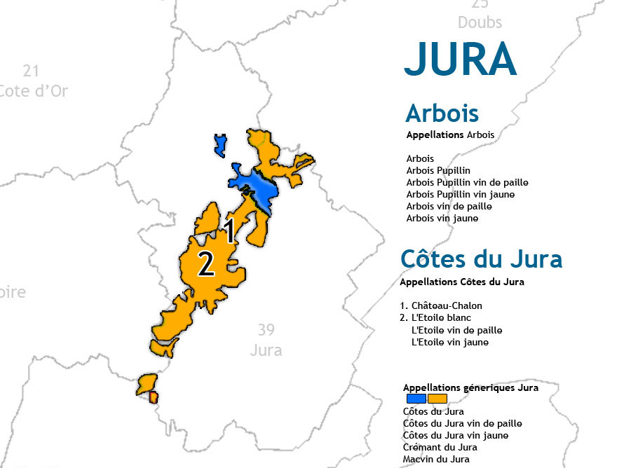 De Jura is een bergachtig gebied in het oosten van Frankrijk, tussen Bourgogne en Zwitserland. De winters zijn koud en guur, de zomers heet en de herfst is lang en zonnig. Je vindt er druivenrassen die nergens anders voorkomen.